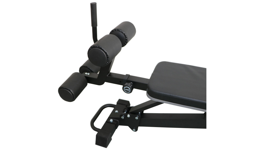 Скамья регулируется по углу наклона в широком диапазоне, до 24°, включая отрицательный. Всего 6 уровней регулировки. Фиксация ног с помощью 4 удобных мягких валиков.
